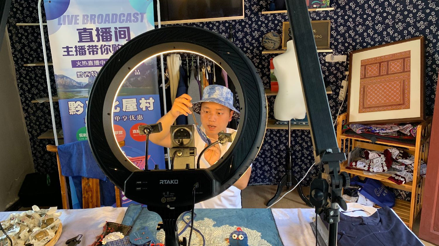 随着中国电商的发展,化屋村的人们也开始直播“带货”。图为主播为直播间的观众们介绍自家工艺品。(凉子 摄)