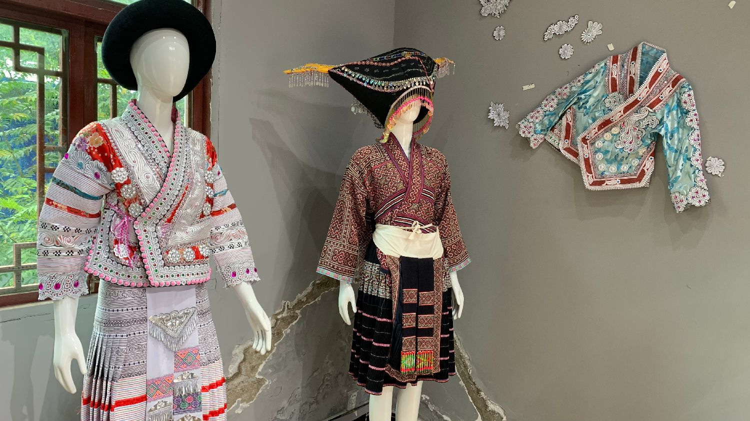非遗苗绣是中国苗族民间传统的刺绣技艺,是苗族妇女勤劳智慧的结晶,在贵州省黔东南的苗族聚集区广为流传。图为苗绣制作的衣服,左侧模特身着衣装为机绣和手绣的混合,右侧模特的衣装则为纯手绣。(凉子 摄)