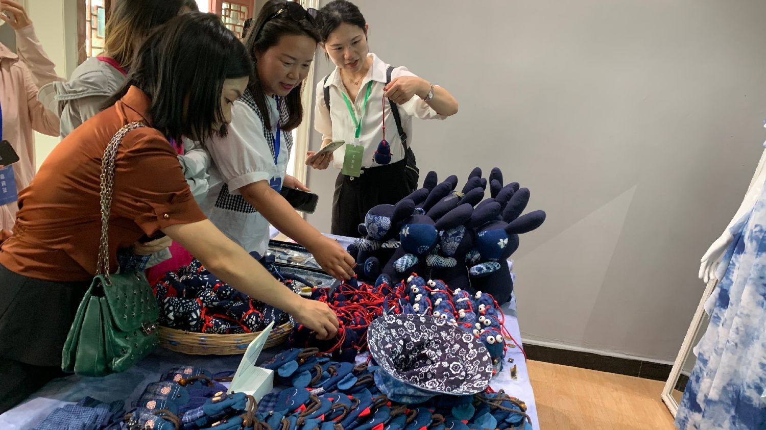 图为海外华媒代表们选购苗绣车间的商品。(凉子 摄)