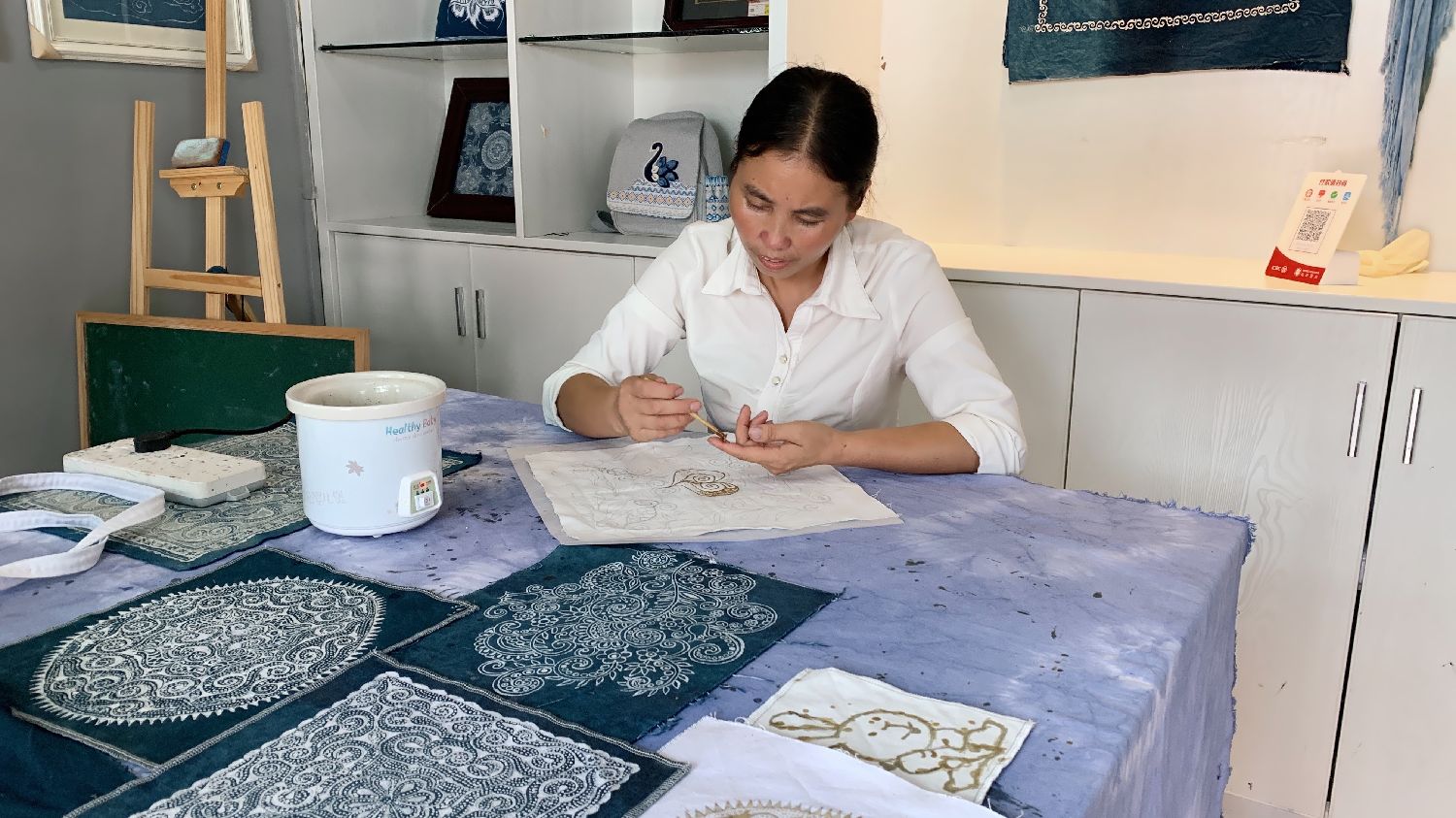 非遗蜡染是中国民间传统纺织印染手工艺,用蜡刀蘸熔蜡绘花于布后以蓝靛浸染,既染去蜡,布面就呈现出蓝底白花或白底蓝花的多种图案,同时,在浸染中,作为防染剂的蜡自然龟裂,使布面呈现特殊的“冰纹”,尤具魅力。蜡染工艺分为“处理”“点蜡”“染色”“去蜡”四个步骤。图为蜡染手艺人在进行“点蜡”的步骤。(凉子 摄)