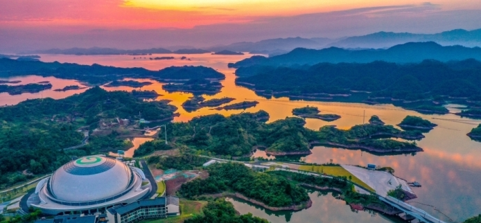 杭州亚运会淳安分村晨曦旭日东升,霞光四射,秋色迷人。(图/中新社)