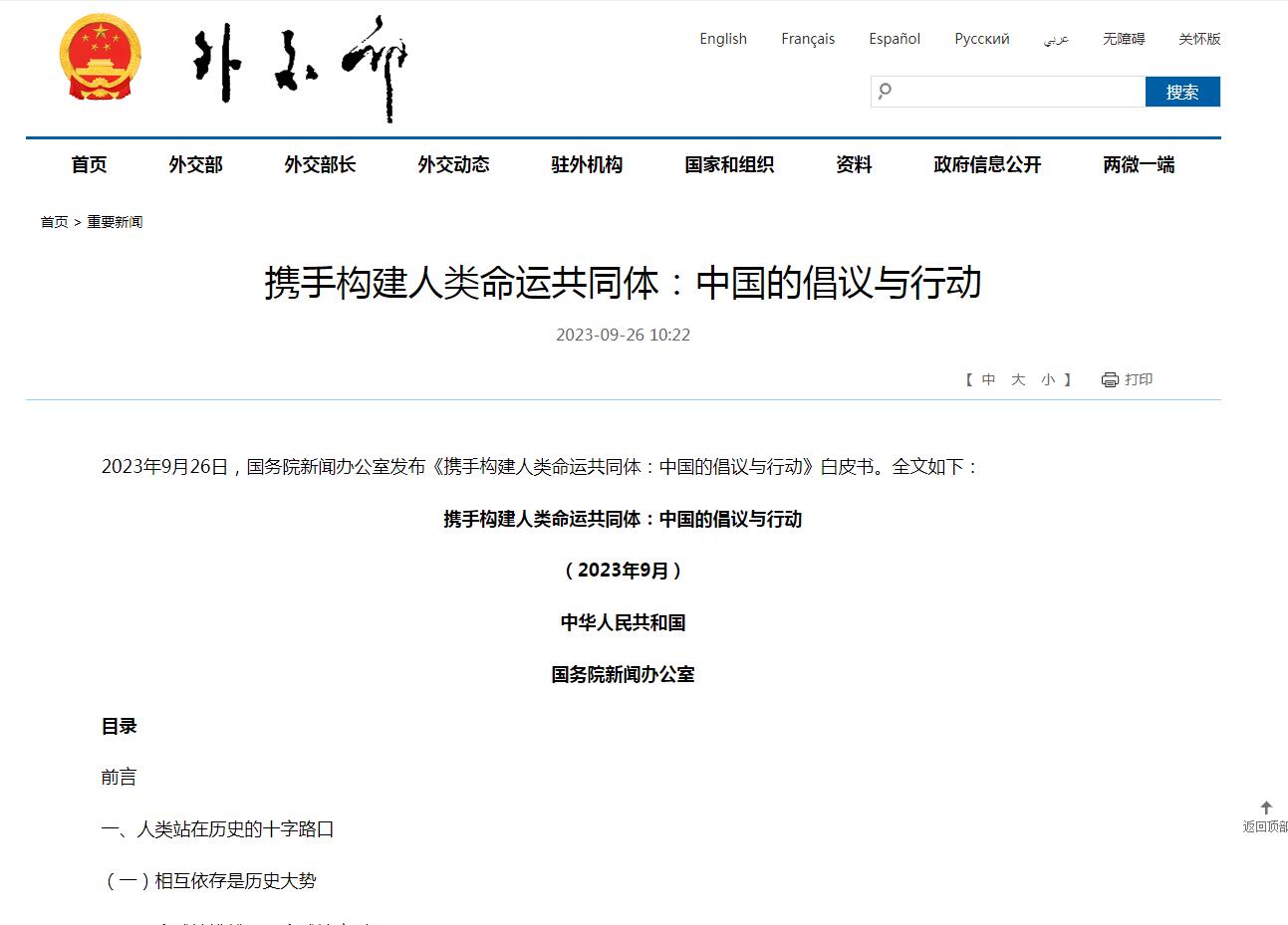 中国发布《携手构建人类命运共同体:中国的倡议与行动》白皮书