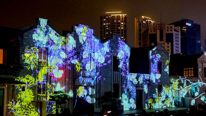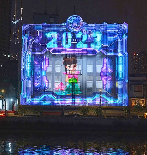 多场沉浸式建筑光影秀,苏河幻光奇境步道,人机光影交互秀……9月26日,为期11天的“Shining Shanghai”2023静安国际光影节在上海苏河湾万象天地天后宫拉开帷幕。