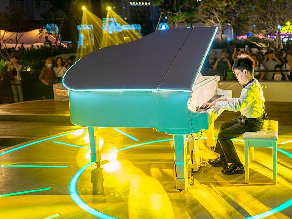 9月28日,“Shining Shanghai”2023静安国际光影节,大型建筑投影交互秀上的小朋友在演奏钢琴。(CFP)