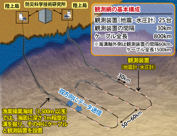 据悉,日本防灾科学技术研究所已经在日本东北到关东的沿海地区,也就是沿着日本海沟部署了被称之为"S-net"的地震海啸观测网络,其中包括地震计和水压计等设备。而气象厅也能利用这些观测数据来发布紧急地震预警。