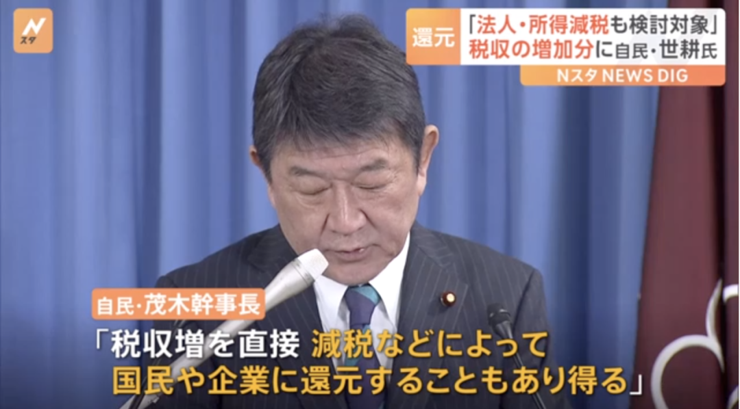 自民党干事长茂木也表示:“也可以直接减税,将经济发展的成果还给国民与企业。”