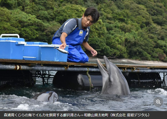 图为在“森浦湾鲸之海”饲养海豚的郑泽鸿。(图/《产经新闻》报道截图)