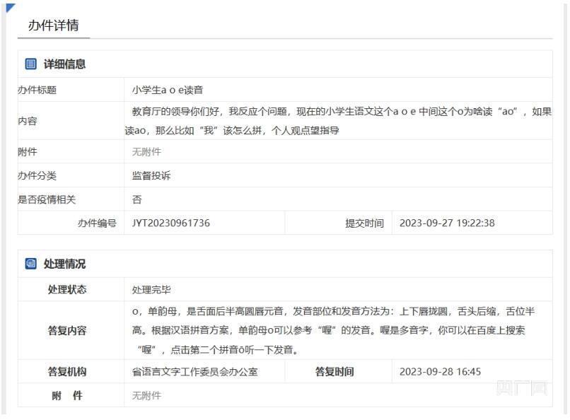 日前,有“较真儿”的家长带着这个问题直接找到了山东省教育厅。9月27日,有人在山东省教育厅网站“留言咨询”栏目中,提出了自己的疑问:现在的小学生语文“aoe”中间这个o为啥读“ao”?