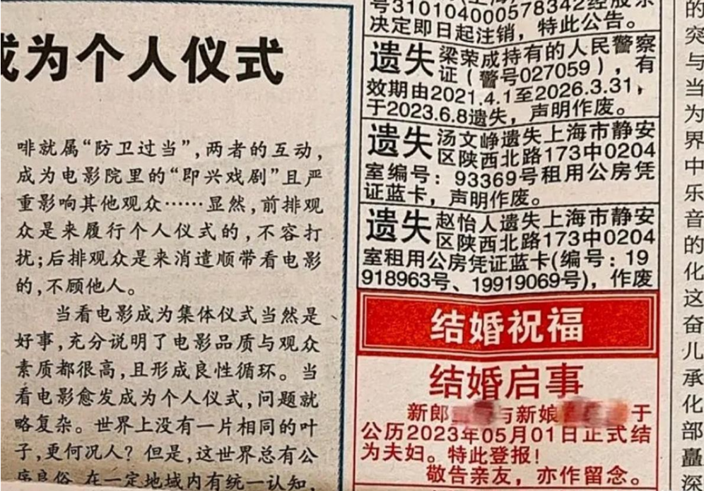 上海的章女士和老公在老家领结婚证时,由于行程匆忙没来得及庆祝。但一个月后,老公突然带回来一份晚报送给章女士,报纸的中缝广告中有一条“结婚祝福”:新郎某某与新娘某某于公历2023年5月18日正式结为夫妇。特此登报!敬告亲友,亦作留念。
