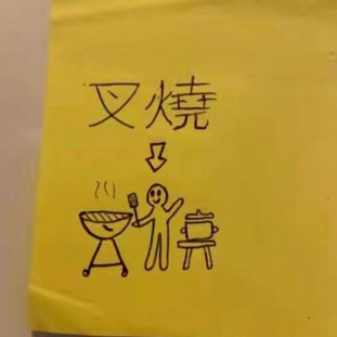 与拼音文字英文不同,中文是一种表意文字。不少外国同学就选择了一种返璞归真的学习方式——画图学习法。比如,这位外国友人以一个人烹制猪肉的图画代指“叉烧”,可把中文是象形文字这个规律摸的透透的了。