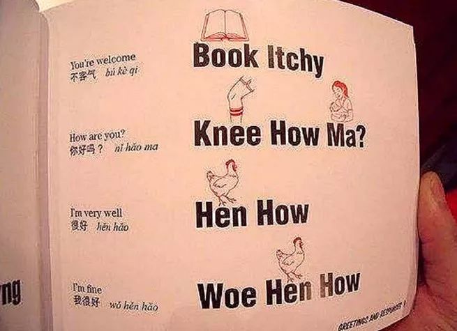 如果每个字都要画幅图来学习的话,还是需要对画画功底有一定要求的。所以,逐字注音法出现了。比如,“Book Itchy=不客气”“Knee How Ma?=你好吗?”“Woe Hen How=我很好”“cheerful ball=支付宝”“shell shell=谢谢”。