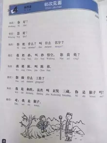 课本中一场简洁明练的人猴对谈,不仅能让人掌握基本的中文社交话术,还能感受到华夏神话《西游记》的魅力。一段短短的对话里,就包含了敬称、姓氏、职业、生物、标点符号等方面的知识点,光是一页课文,就全是干货。