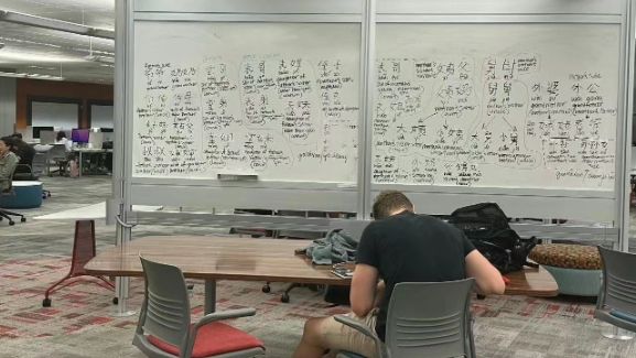 “美国大学图书馆惊现中国家谱”这条热搜来自于一位网民在自己的社交账号上发的一条帖子。这位网民表示,她在美国大学的图书馆偶然发现了两个白板,上面用中文写满了七大姑八大姨的关系和称呼。她猜测应该是某个美国同学在中文考试前的复习战况。