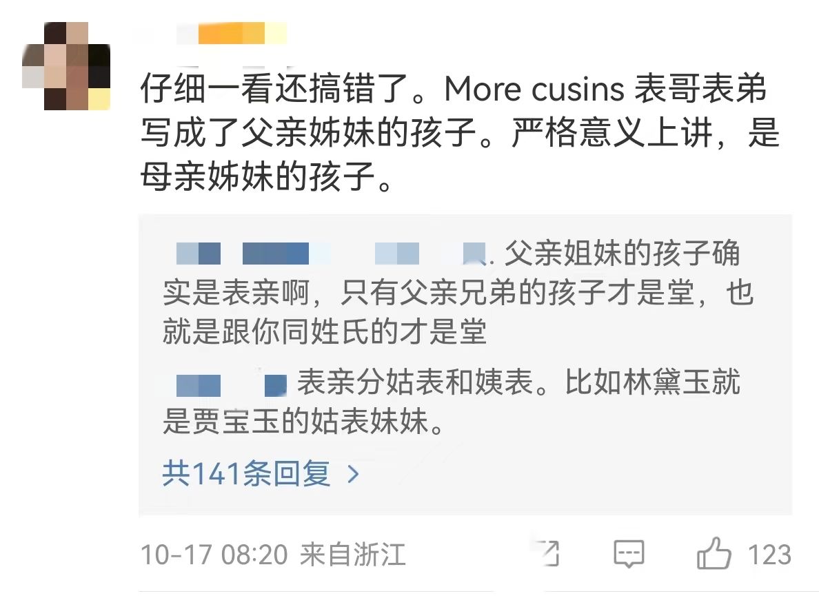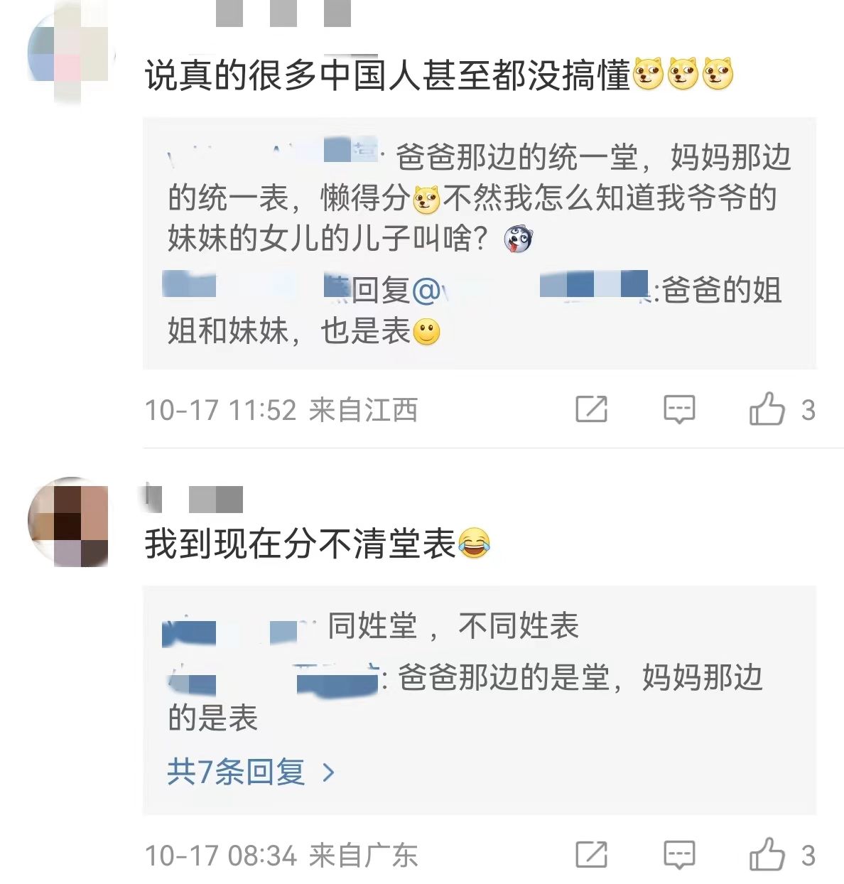 很多网民都表示纷纷理解并共情道,“说真的很多中国人甚至都没搞懂”“我到现在都分不清堂表”。