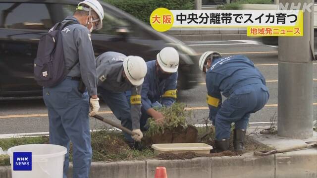 (日本头条讯)在大阪梅田的御堂筋中央分隔带上,发现了西瓜,大阪市于16日进行了移植工作。