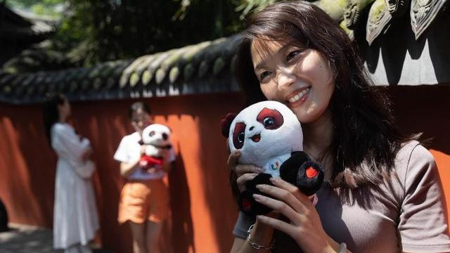 游客手捧成都大运会吉祥物“蓉宝”在杜甫草堂的红墙边留影。(图/新华社)