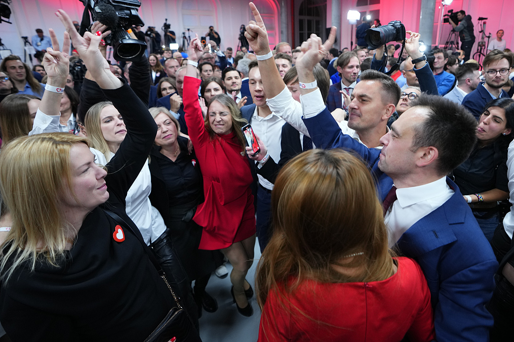 当地时间2023年10月15日,波兰华沙,前总理唐纳德·图斯克的支持者在他的政党总部庆祝。(视觉中国)