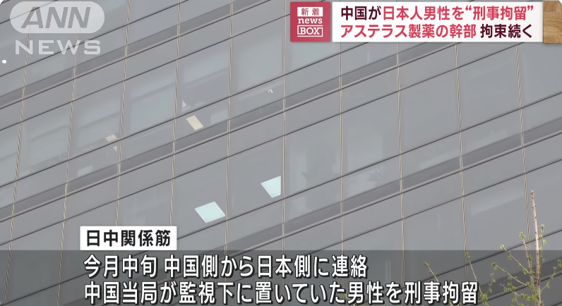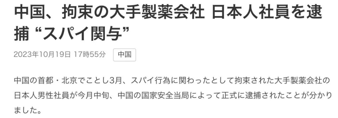 10月19日,日本大型药厂安斯泰来(Astellas Pharma)一名驻中国的50对岁日籍职员,今天在北京正式被中国国家安全局以涉嫌间谍罪逮捕。