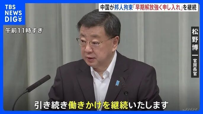 松野官房长官在下午的记者招待会上表示:“今年3月,在北京因违反中国国内法而被拘留的50多岁的日本男性已确认于10月中旬被捕,日本政府打算继续要求中方尽快放人。我们将尽可能提供与家人的联系等支援,继续妥善应对。”。