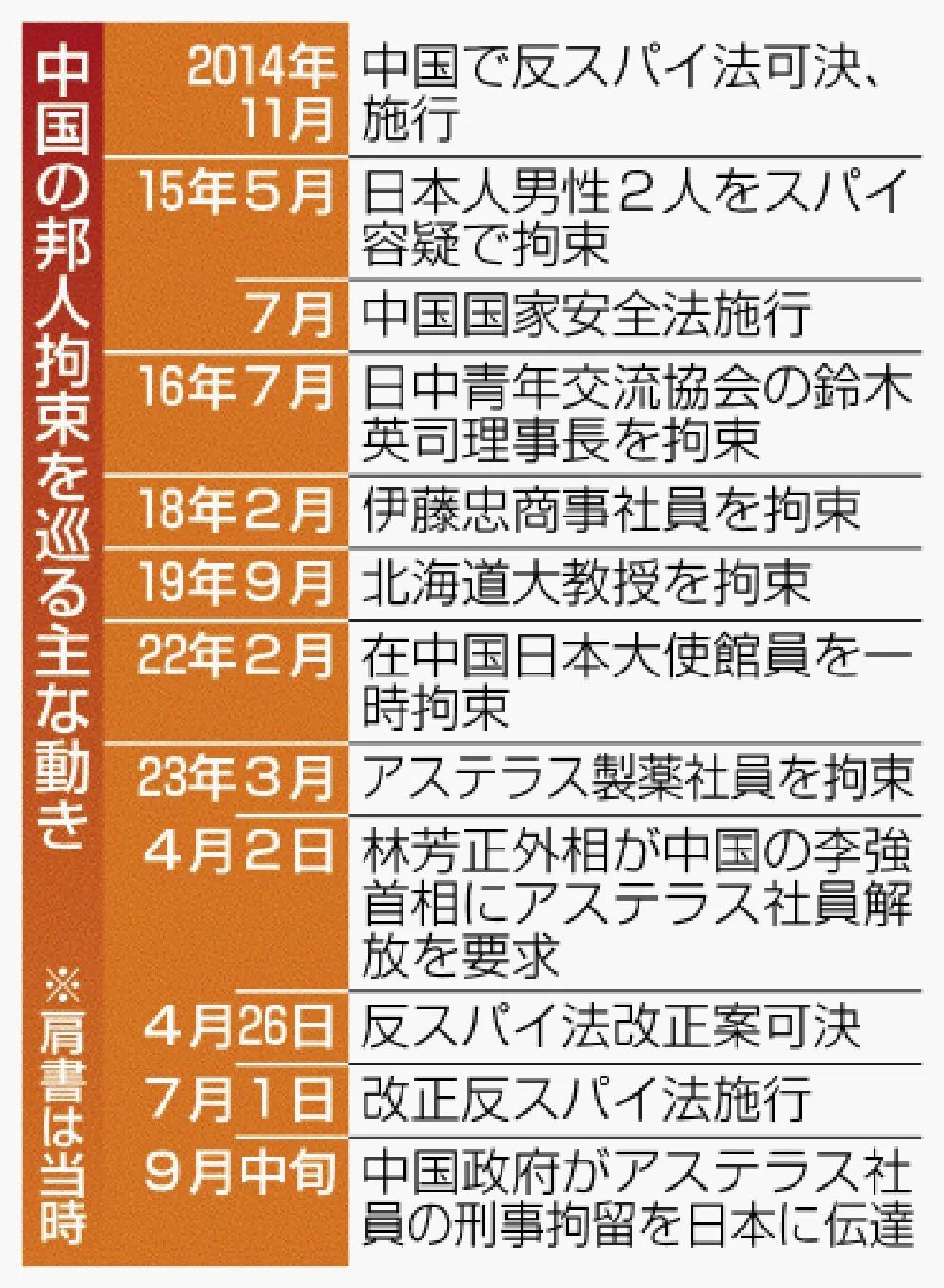在中国,自2014年实施反间谍法以来,因日本人参与间谍行为而被当局拘留的情况相继发生,今年7月扩大了间谍行为定义的修改反间谍法也被实施,因此在外国企业等之间的担忧正在扩大。