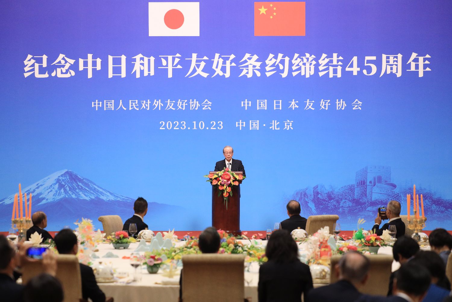 纪念中日和平友好条约缔结45周年招待会10月23日在北京钓鱼台国宾馆举行。日本前首相福田康夫和约200名日中各界代表出席。