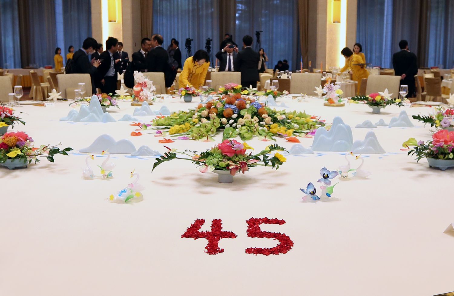 10月23日,工作人员正在布置会场,红色花瓣组成的“45”字样醒目。(郑闻 摄)