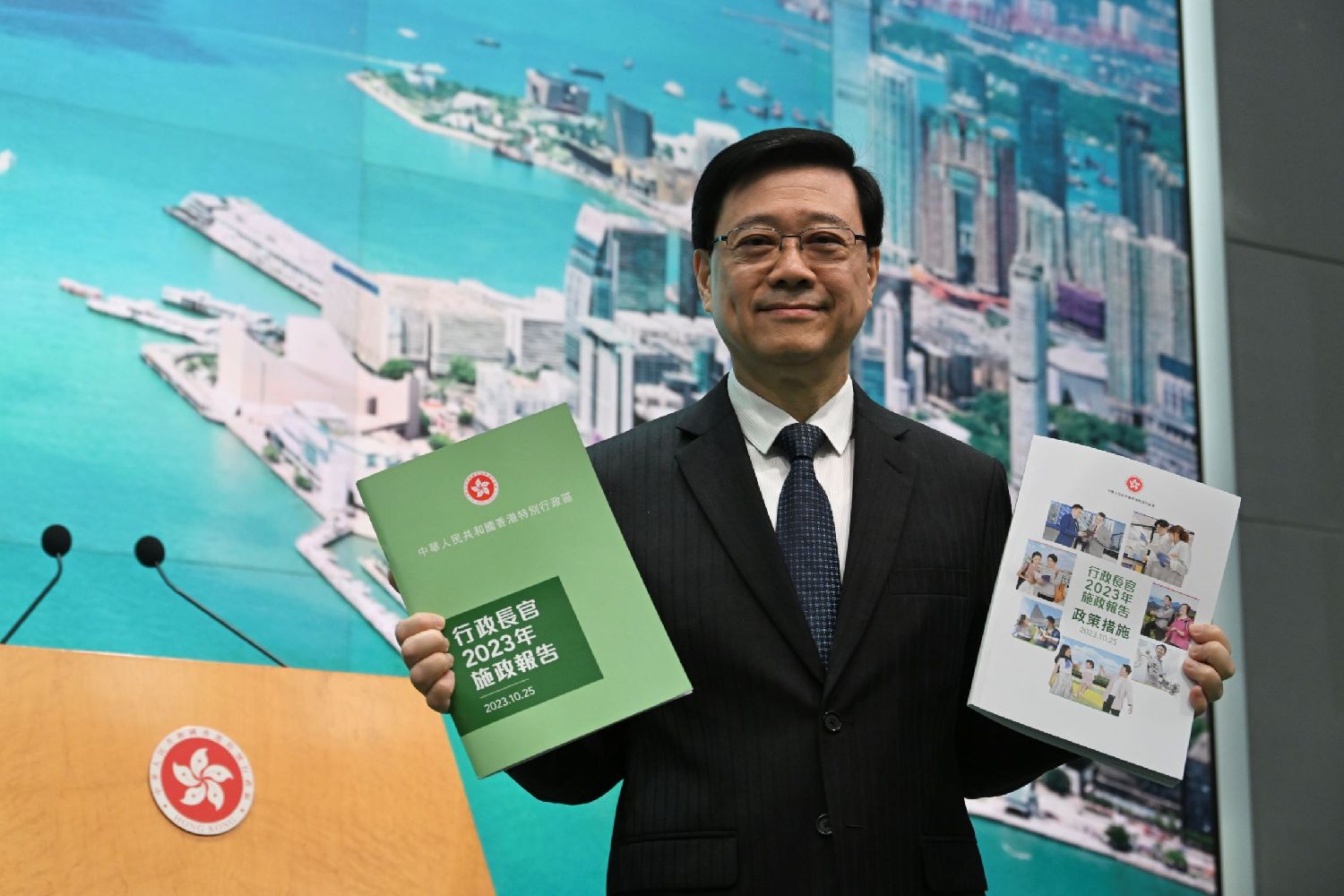 图为当地时间24日上午,李家超出席行政会议前会见传媒时展示新一份施政报告。(图/中新社)