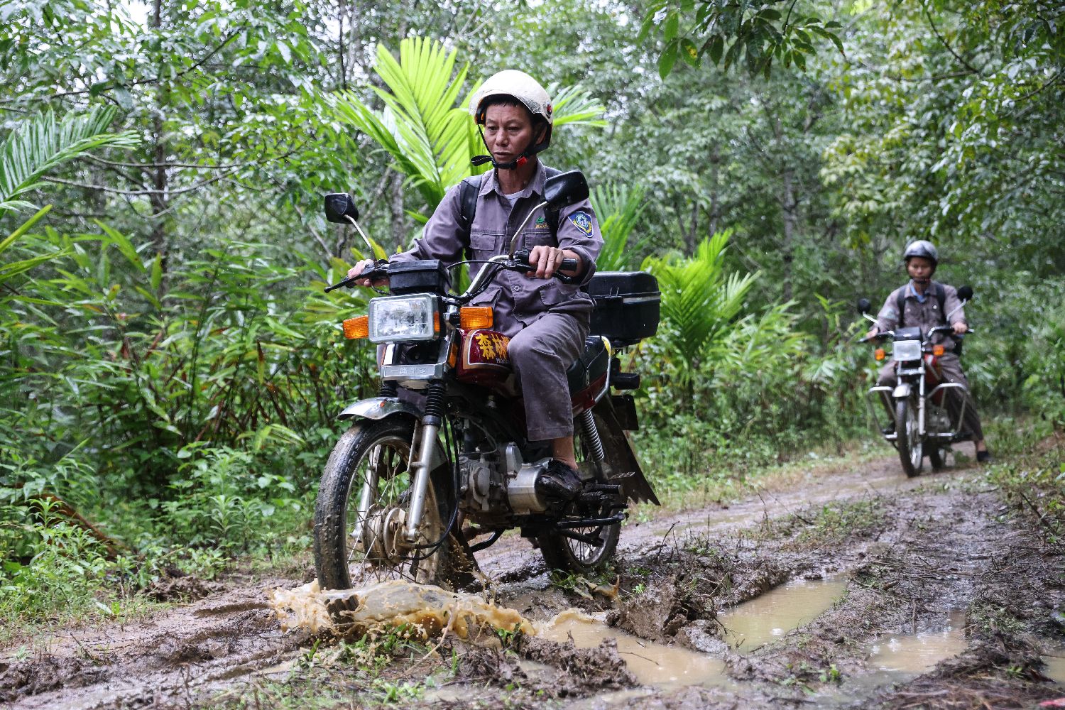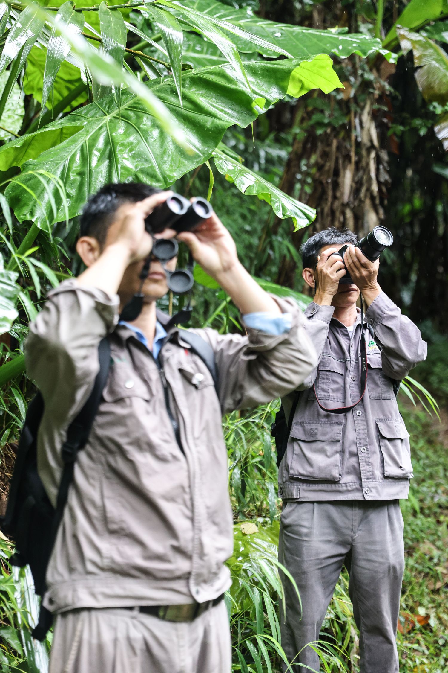 十余年间,李文永为海南长臂猿拍摄了数万张照片。这些照片和监测队员的日常监测工作,为科研工作者了解掌握海南长臂猿生活习性、种群变化规律等情况,积累了详实和宝贵的监测数据。图为海南长臂猿监测队队员李文永(左)和同事在海南热带雨林国家公园霸王岭片区工作。(新华社)
