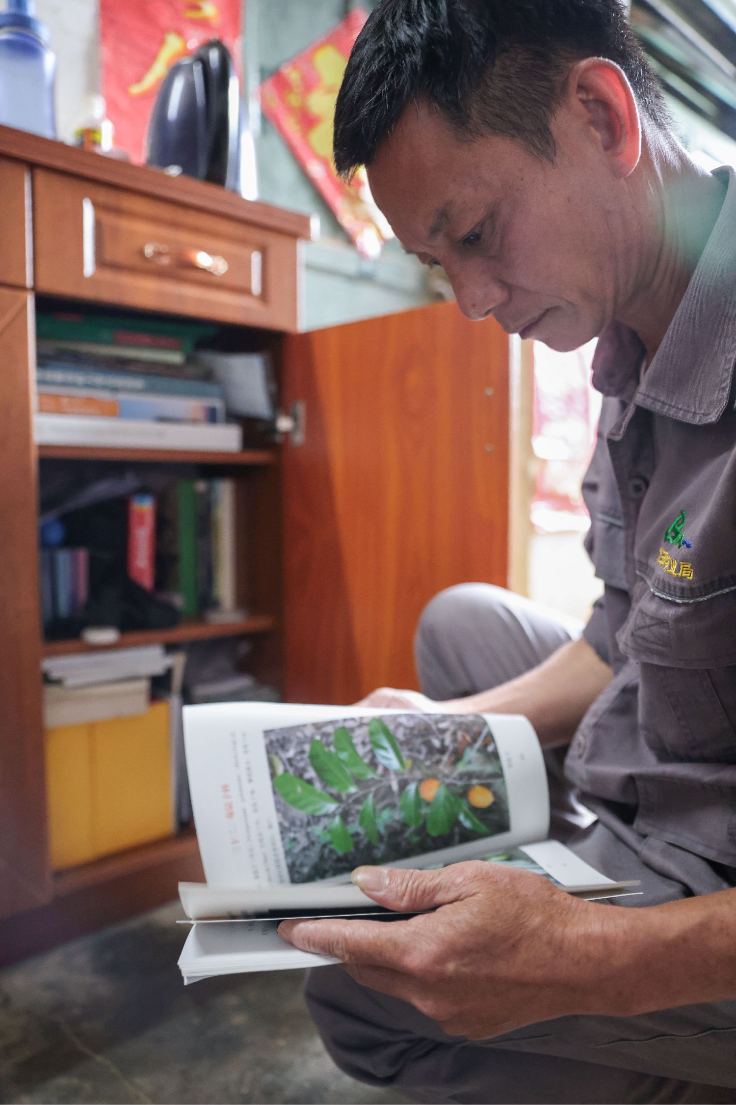 海南长臂猿监测队队员李文永在家中翻阅关于海南长臂猿喜食植物的书籍。(新华社)