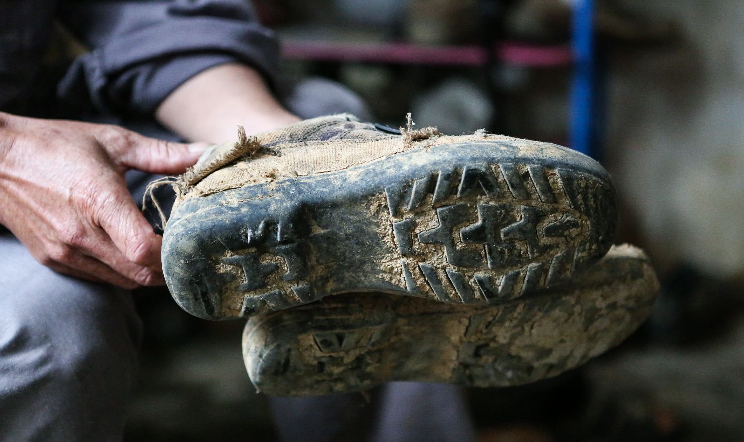 海南长臂猿监测队队员李文永展示一双因长期上山而穿烂的鞋。(新华社)