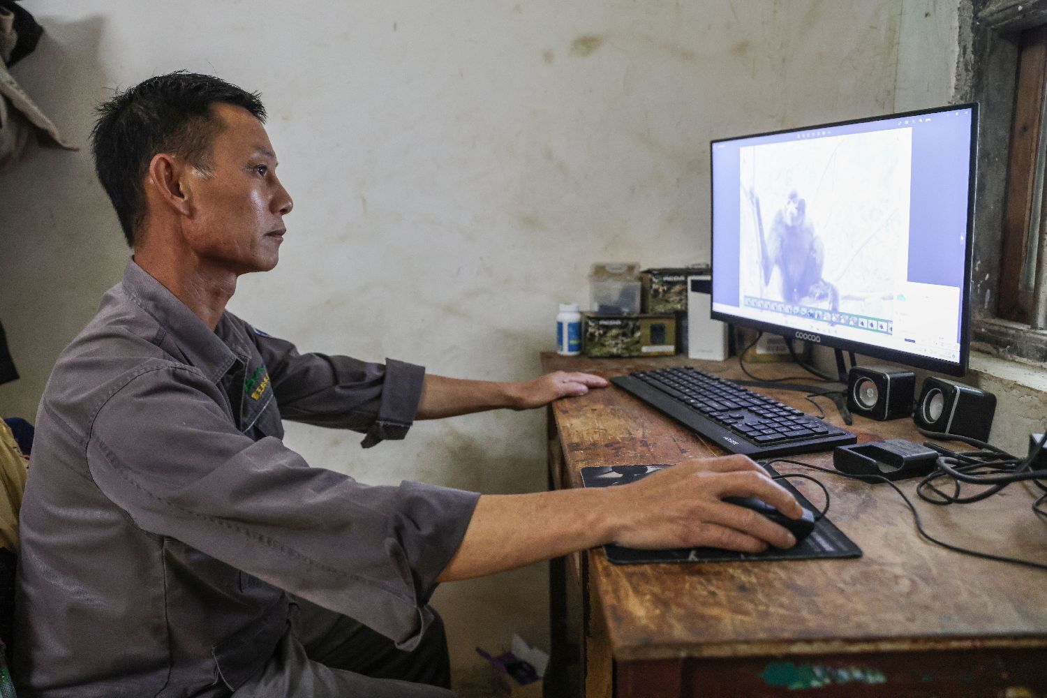 海南长臂猿监测队队员李文永在家中查看拍摄的照片。(新华社)