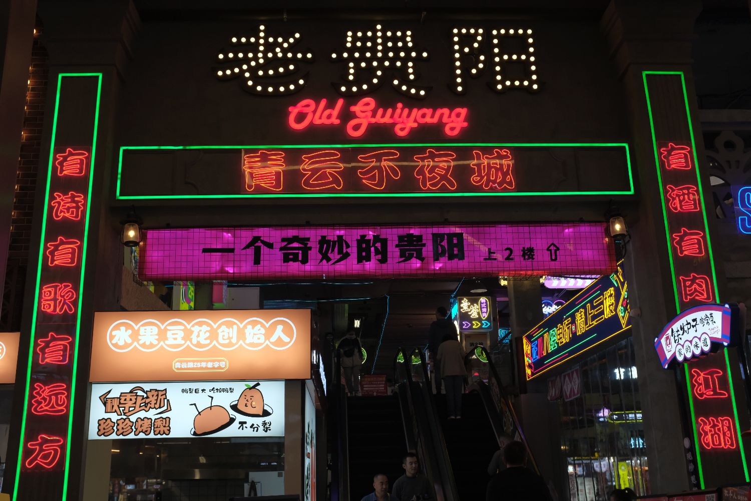 市集里聚集了上百家贵州本土特色小吃,除了不少网红店以外,还有一些贵阳的老字号品牌。图为青云不夜城门口。(园子 摄)