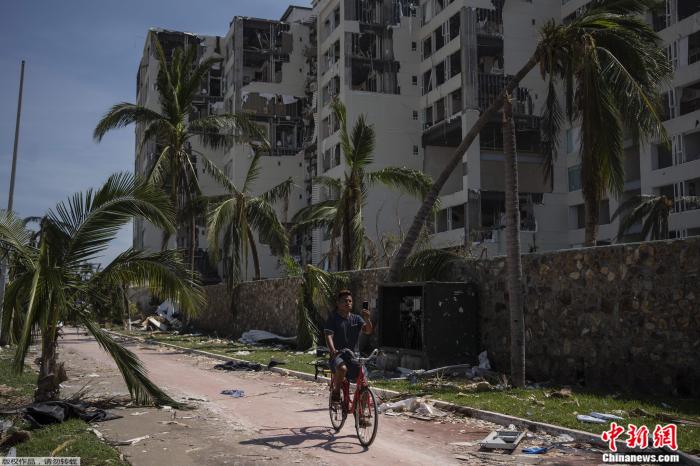 10月29日,墨西哥阿卡普尔科,一名男子在受灾地区骑行。