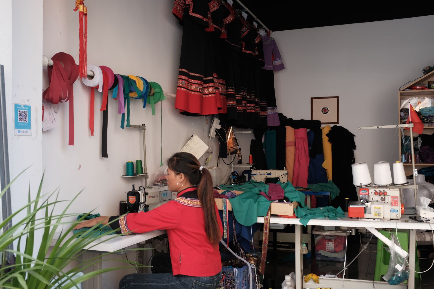 参加“行走中国·2023海外华文媒体高层多彩贵州行”的海外华文媒体代表们10月30日来到了位于贵州省西南部的册亨县。册亨县是布依族聚居地,素有“中华布依第一县”、“中国布依族刺绣艺术之乡”等美誉,全县70%的布依妇女熟练掌握着织布、染印、制作手工民族服饰等技艺。图为绣娘正在制作布依民族特色服饰。(园子 摄)