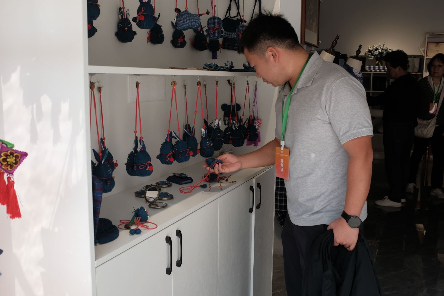 图为华媒代表欣赏蜡染手工制品。(园子 摄)