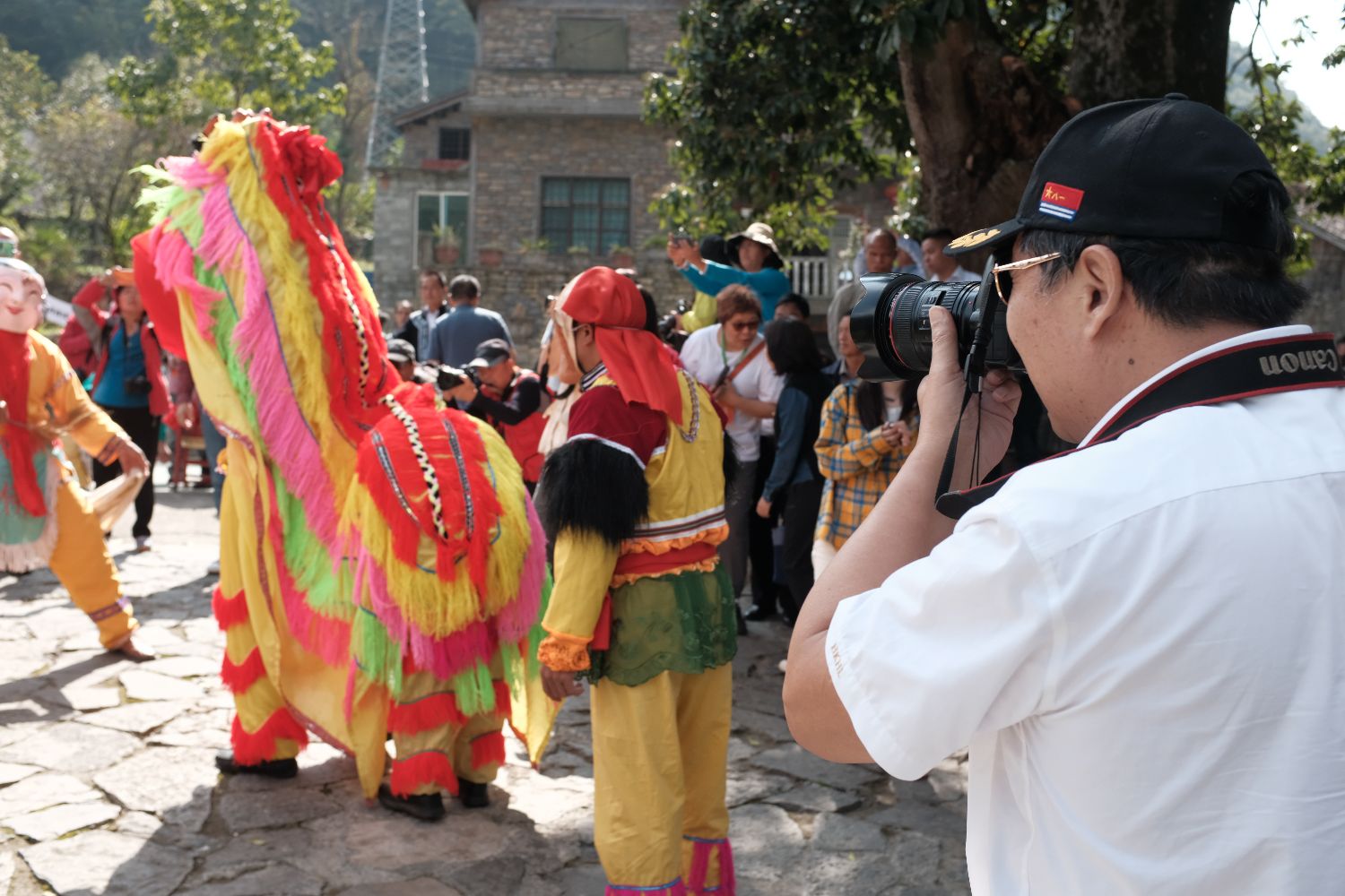 位于册亨县冗渡镇威旁村西北部的陂鼐古寨,是保护较好的布依族传统村落。图为布依舞狮吸引华媒代表拍照。(园子 摄)