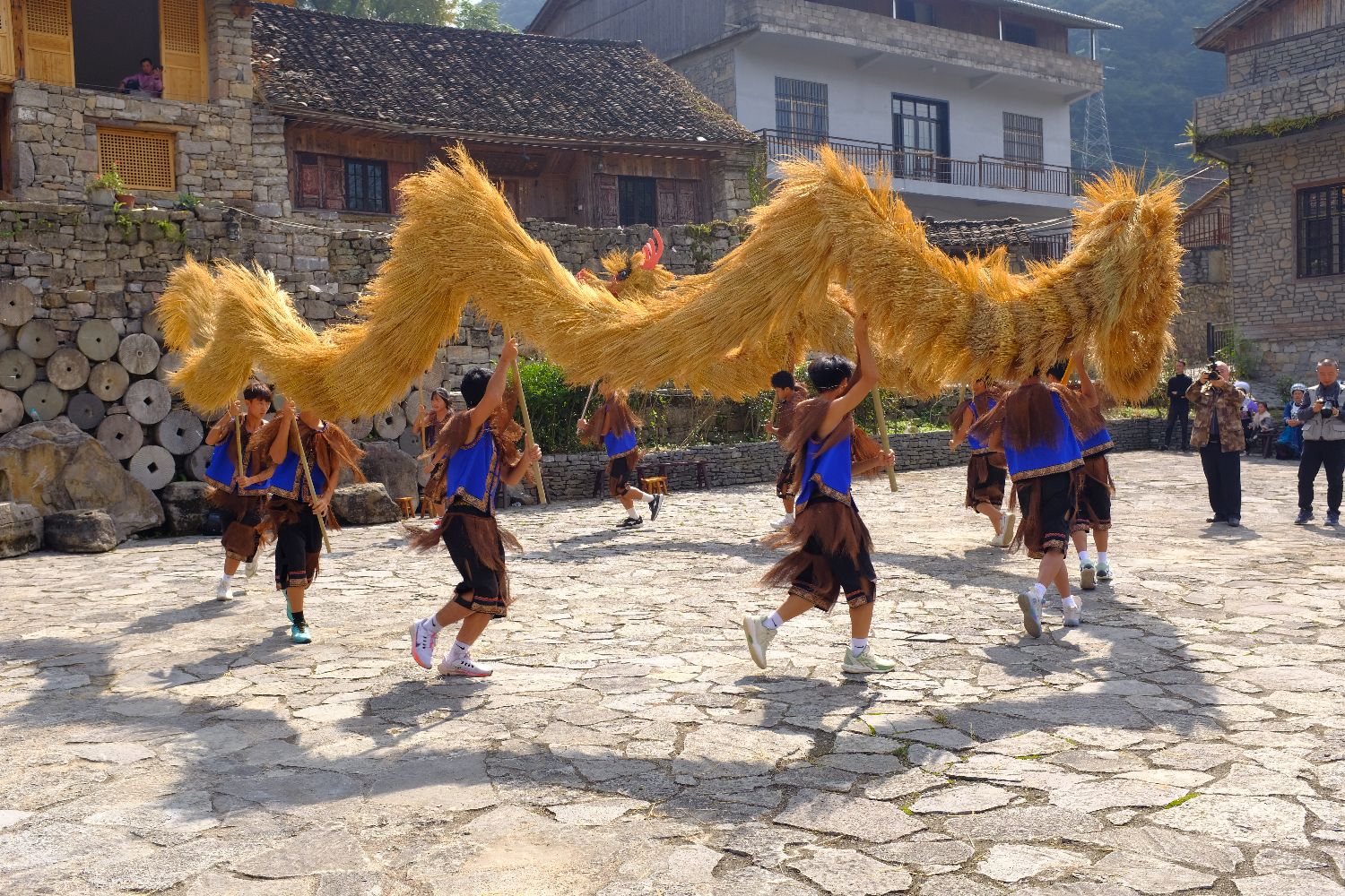 图为当地村民表演《布依山龙》。《布依山龙》又称布依草龙,是贵州省第五批省级非物质文化遗产。(园子 摄)