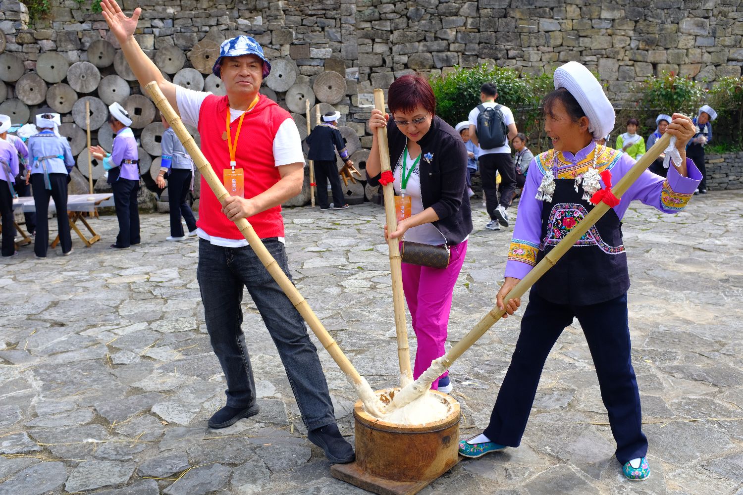 图为华媒代表体验打糍粑。册亨的布依族人,逢年过节都要打糍粑招待亲朋好友。(园子 摄)