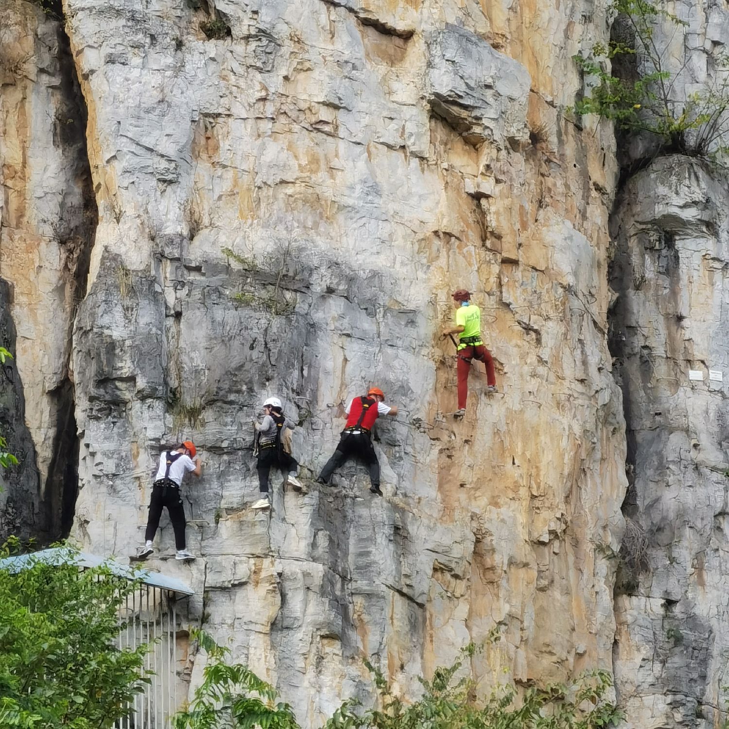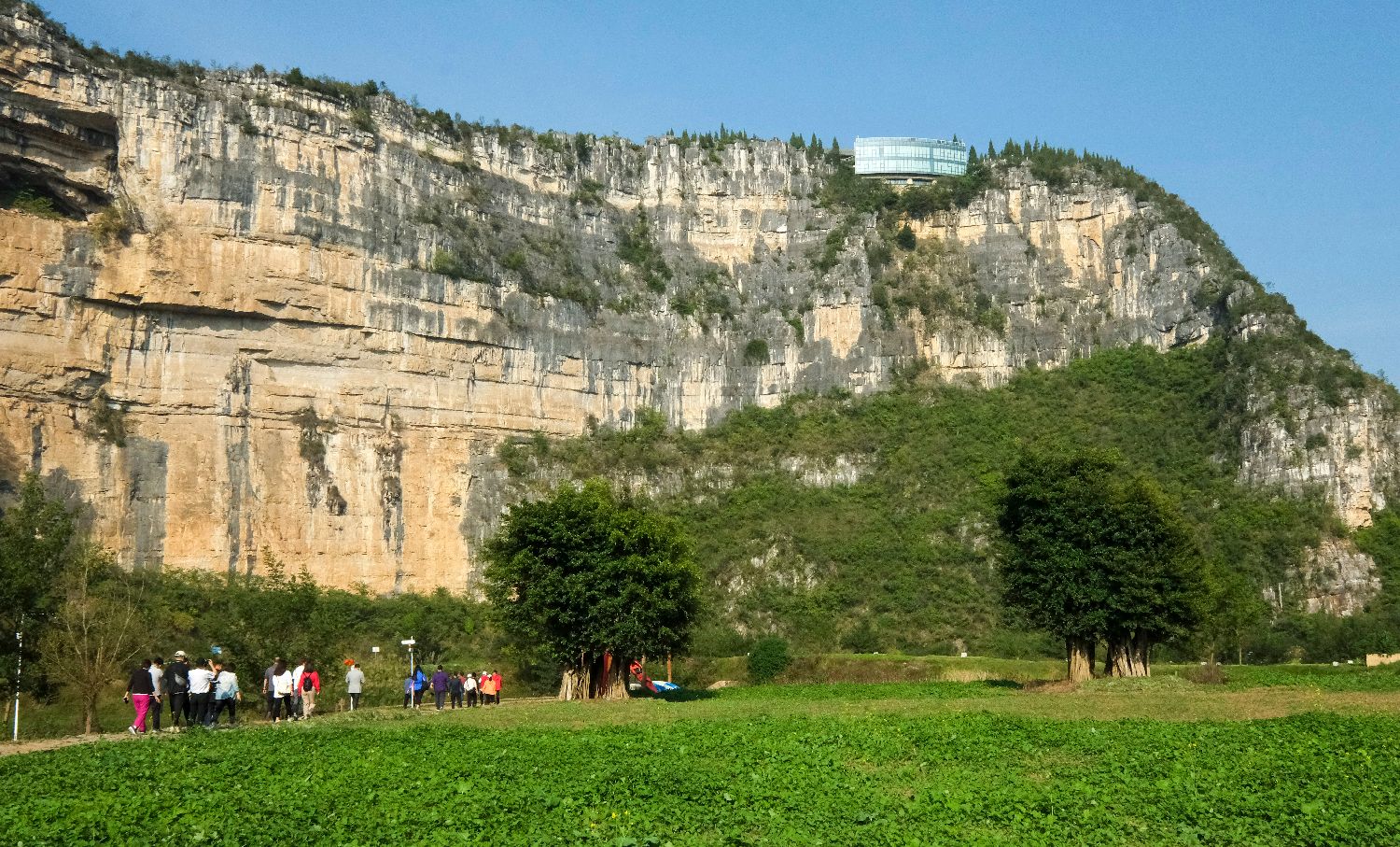 近日,参加“行走中国·2023海外华文媒体高层多彩贵州行”的海外华文媒体代表们来到了安龙国家山地户外运动示范公园。该公园是一座集极限运动、旅游度假等活动于一体的综合性山地户外运动示范公园。图为华媒代表们聚集在公园内的攀登崖壁下。(园子 摄)