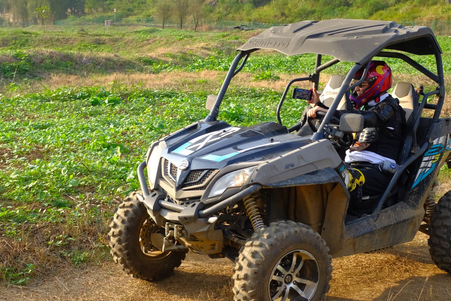 图为华媒代表体验自驾越野车并自拍留念。(园子 摄)
