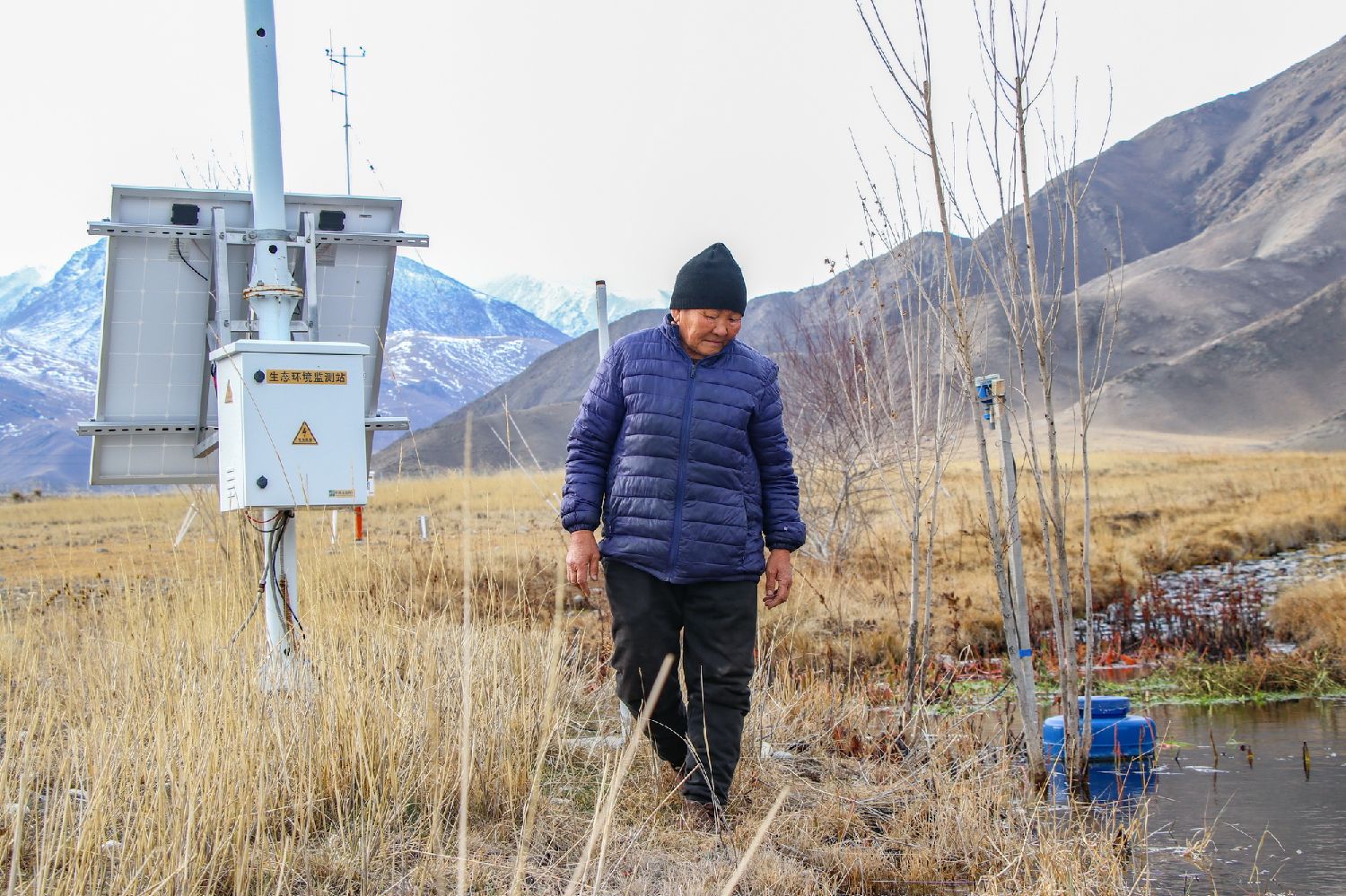 67岁的管护员冬花在温泉新疆北鲵国家级自然保护区工作已经有20年。图为11月1日,她在保护区内查看新疆北鲵的情况。(图/中新社)