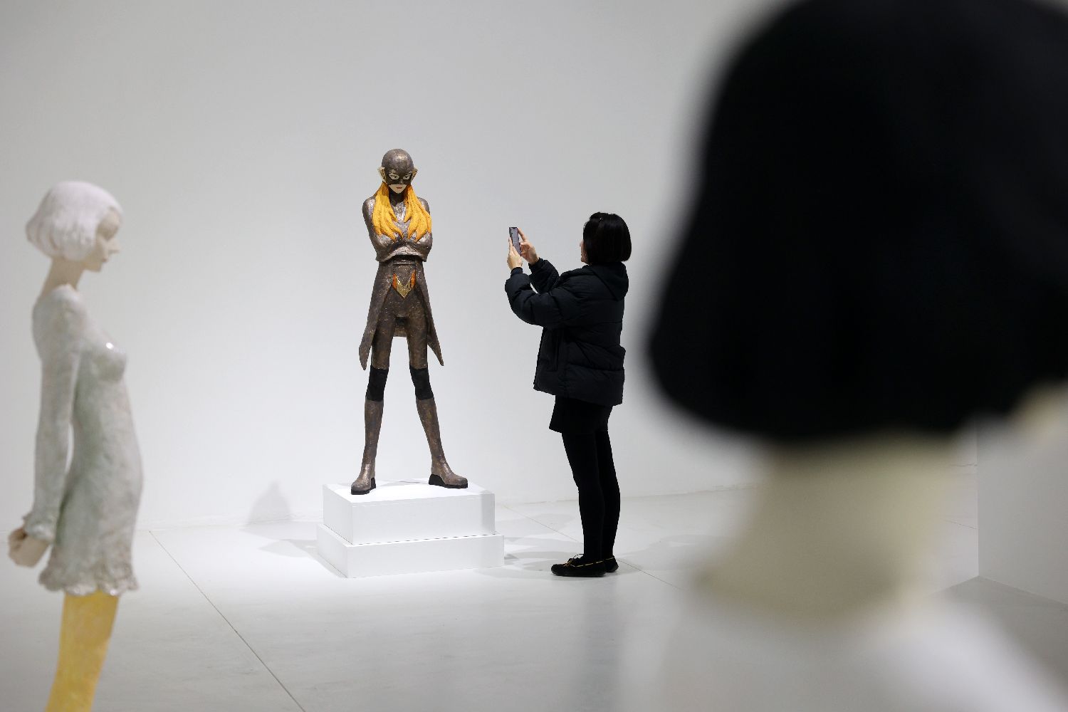 2023年11月7日,2023年的最新作品《CU2308-mask》吸引参观者拍摄。据了解,北川宏人在意大利受到许多雕塑大师的影响,包括Marino Marini、Giacomo Manzừ、Alberto Giacometti,然而他的内心始终思念着故乡并希望作品呈现出日本精神,更确切地说是传达出属于他这个世代的日本年轻人特质和他们的内心世界,因而在1999 年之后,他的作品渐渐显现出动漫的风格。(黎明 摄)