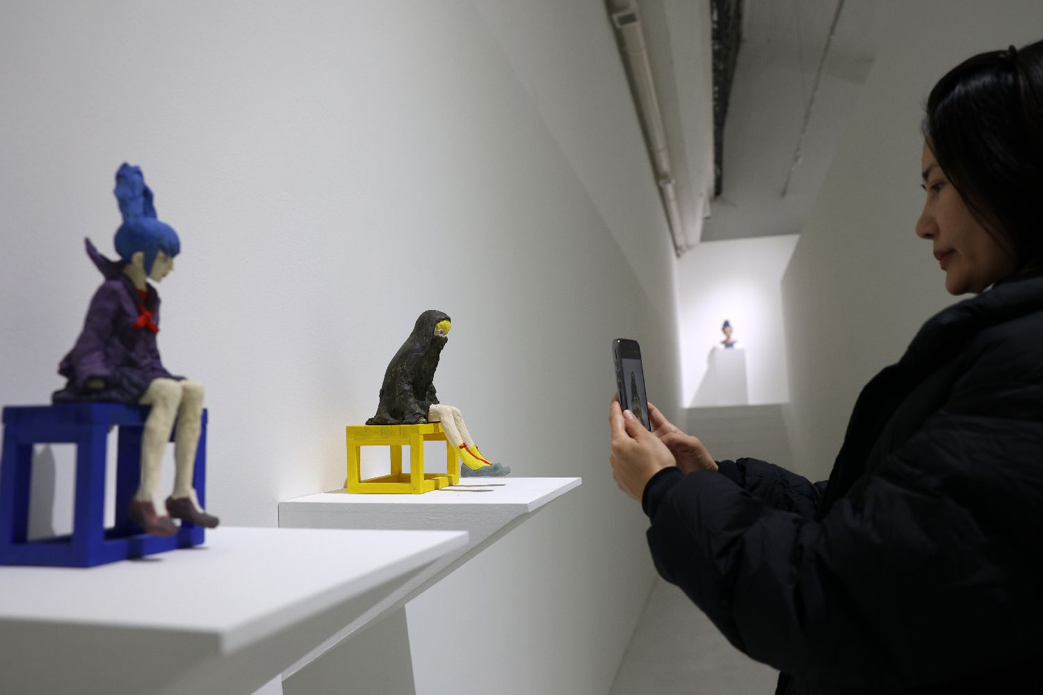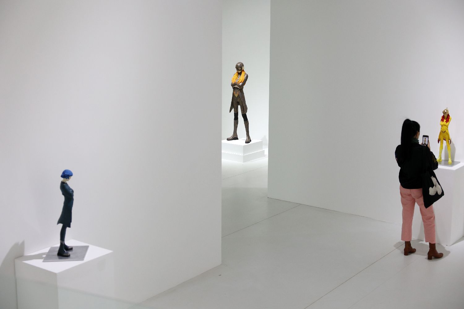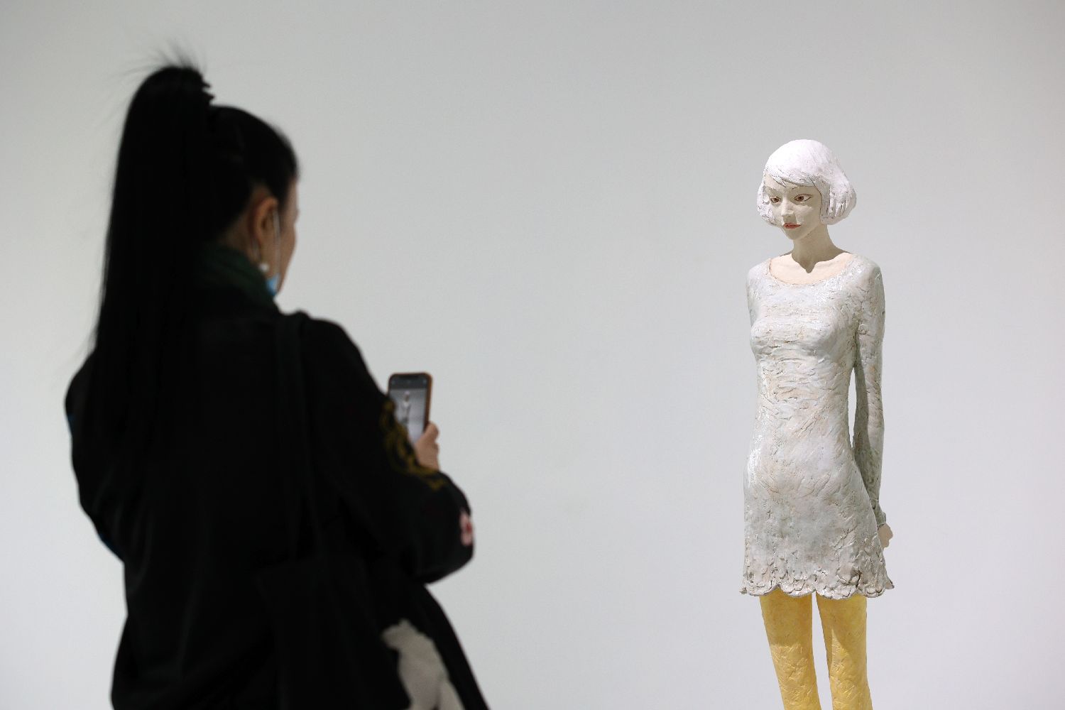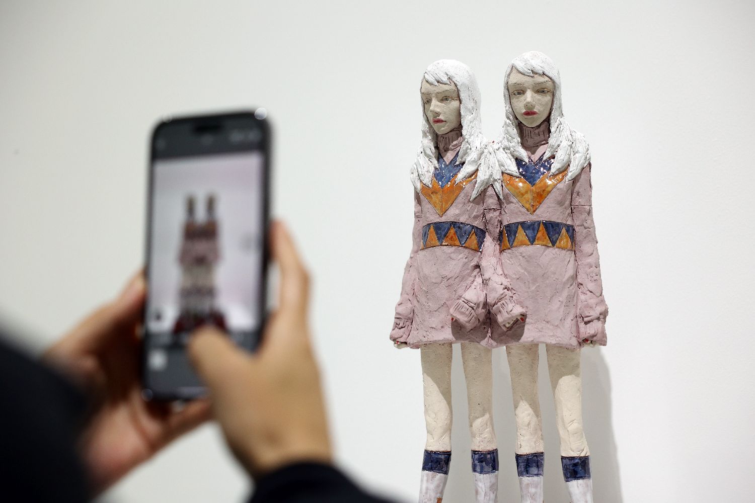 2023年11月7日,日本雕塑艺术家北川宏人的作品吸引参观者拍摄。(黎明 摄)