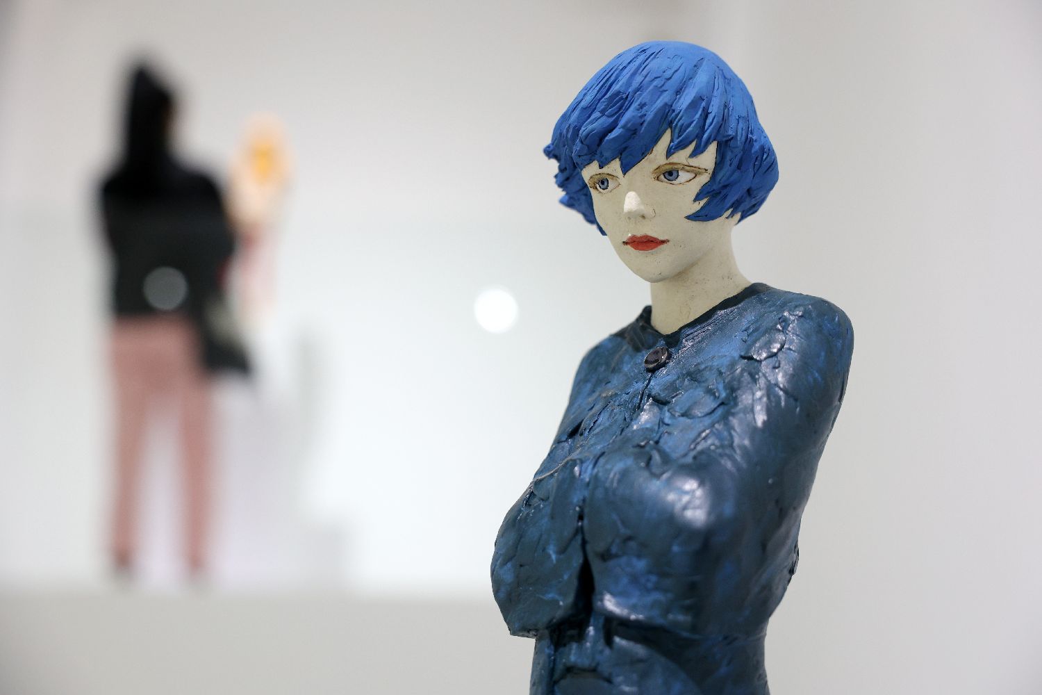 2023年11月7日,日本雕塑艺术家北川宏人2023年的陶瓷釉彩作品《CU2306-blue cloak》亮相展厅 。(黎明 摄)