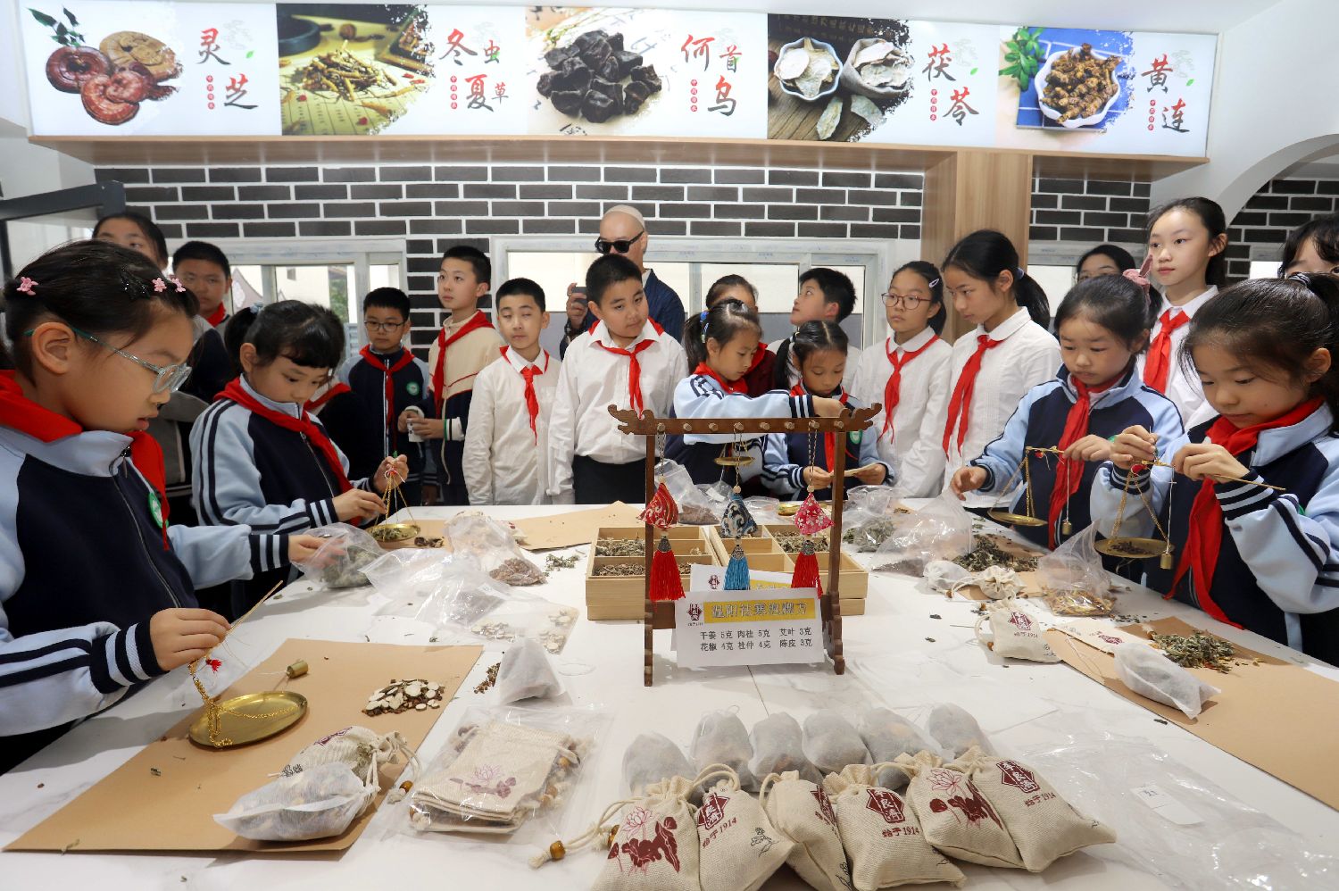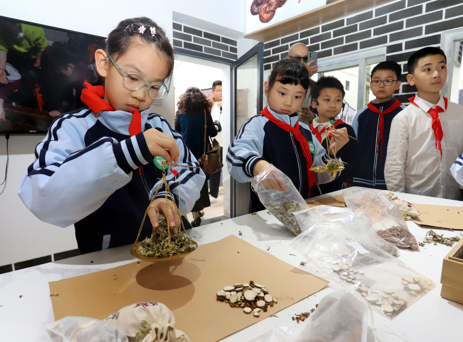 苏州市平江实验学校与苏州李良济国医馆共建的中草药文化馆以“寻味•问道”为主题,分为室外百草园和室内展馆两部分,集“种植、采摘、烘培、研制、展示”于一体,以传播中医药文化为宗旨,把传统中医药文化植入到学校教学中去。图为学生在校园内的中草药文化馆参观体验。(中新社)