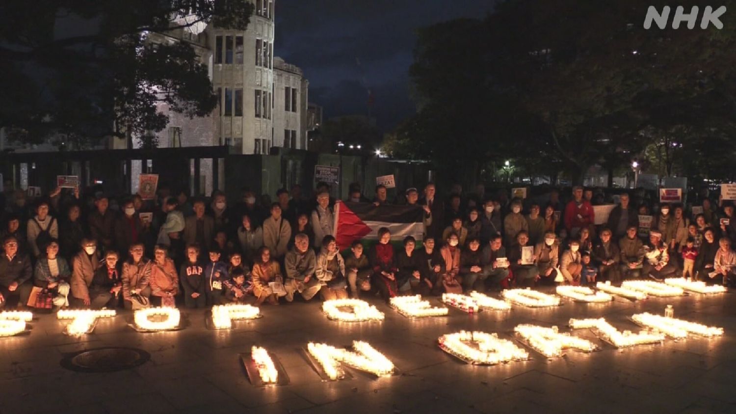 广岛市原爆穹顶前,市民团体成员点燃蜡烛呼吁加沙停火