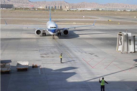 喀什徕宁国际机场航空勤务人员引导飞机对接廊桥。(图/中新网)