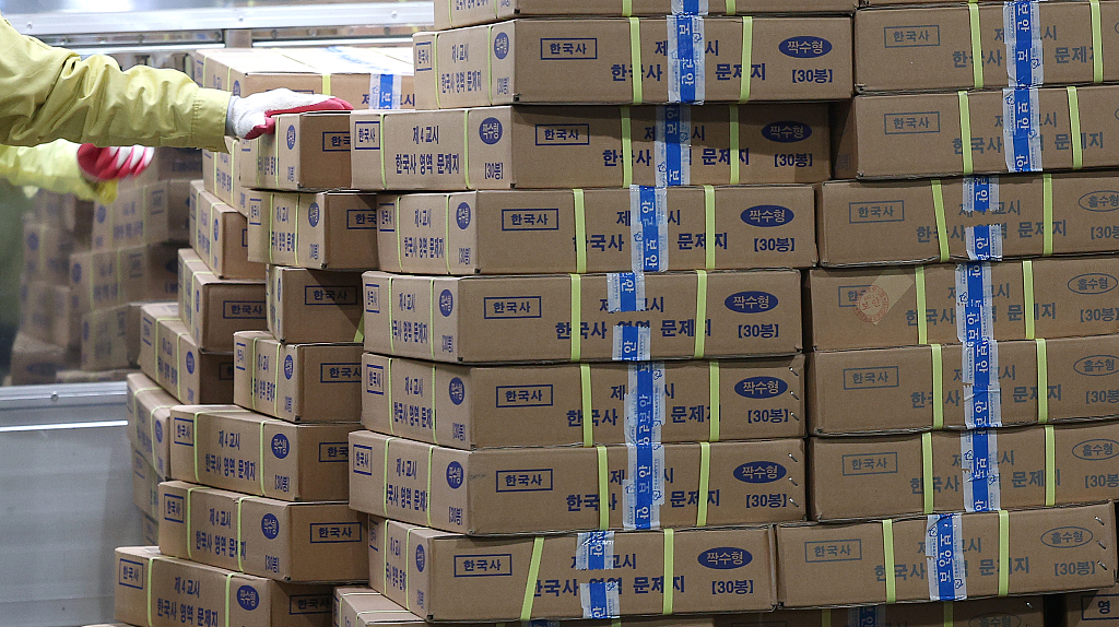 当地时间11月13日,韩国2024年度高考试卷抵达大邱,大邱教育厅负责人正在搬运。(视觉中国)