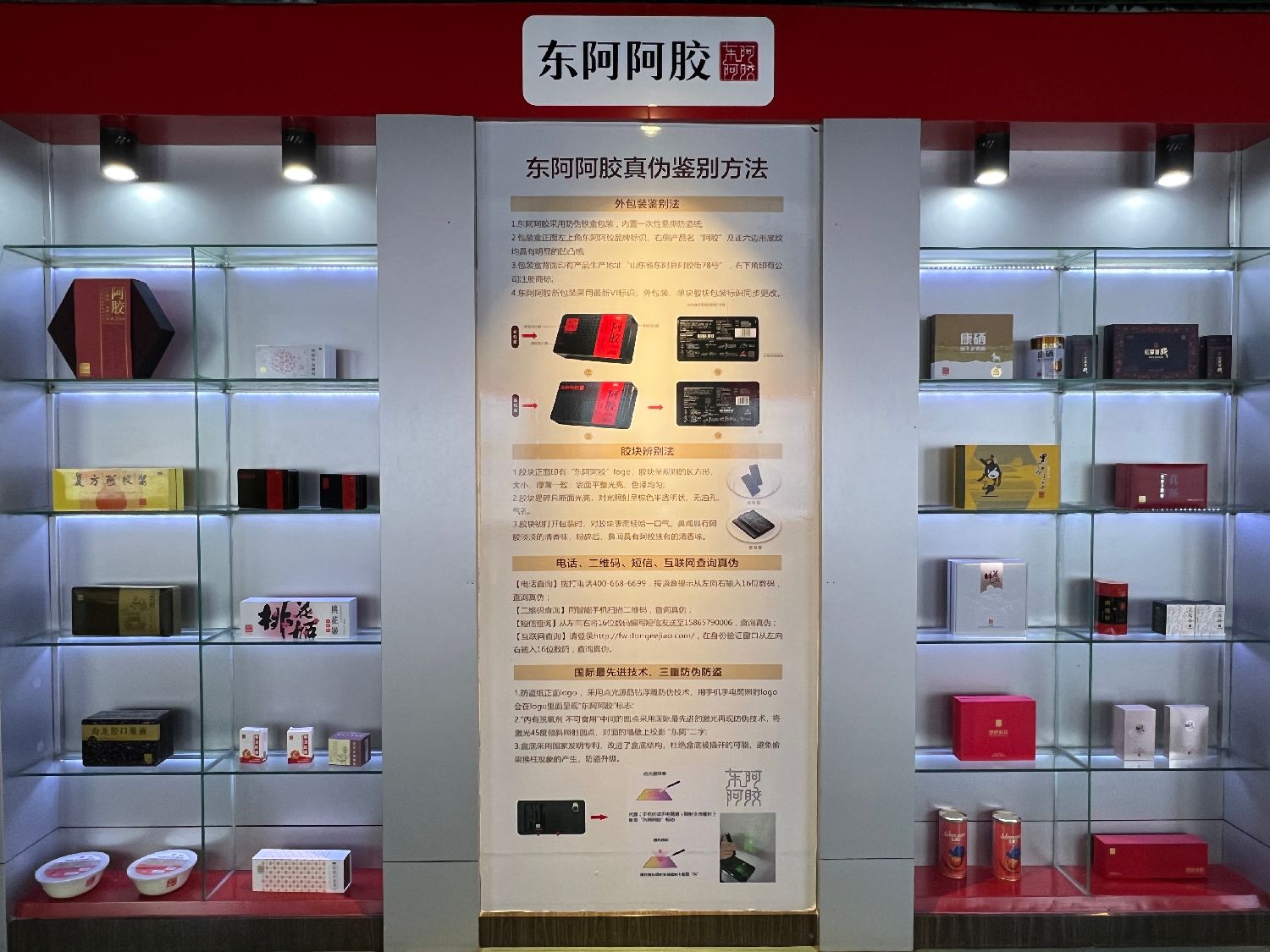 如何避免买到假冒的东阿阿胶产品?展厅内陈列着“东阿阿胶真伪鉴别方法”详解。(江津 摄)