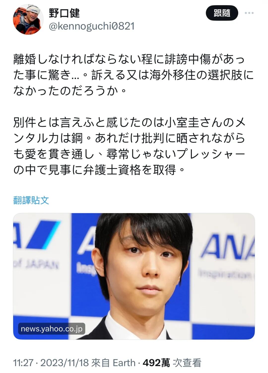 “看到羽生结弦离婚,我想起那个无论在什么情况下都不会动摇决心的小室圭,他的心态真的让人不得不佩服啊。”